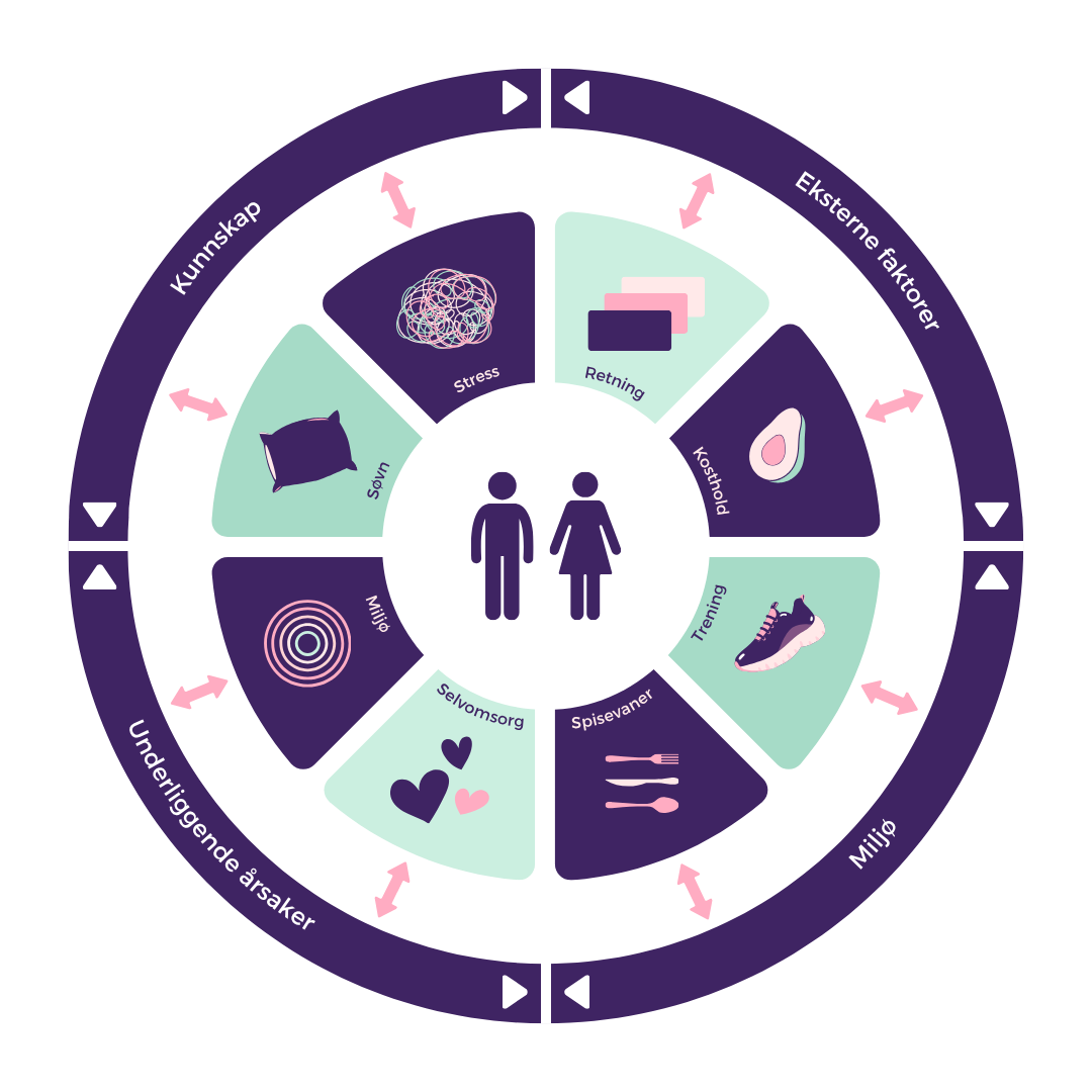 De åtte livsstilsområdene i vår modell viser hvordan kropp, sinn og hverdag henger sammen. Utenfor dem finner du de ytre påvirkningene – som også spiller en rolle for hvordan sykdommen opptrer – og hvordan vi har det.